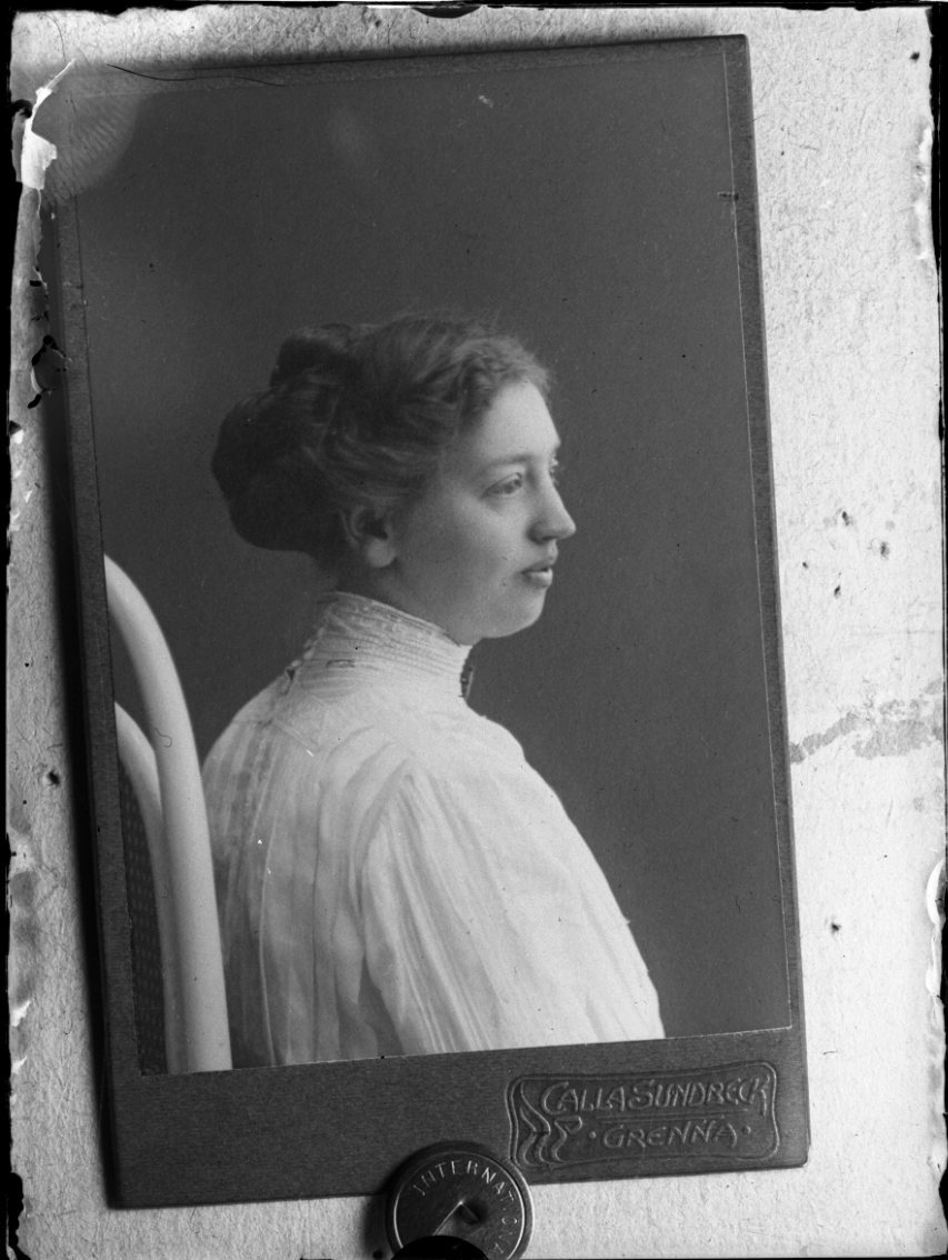 Reprofotografi av kabinettsfotografi med okänd kvinna i 3/4-profil. Hon sitter på en stol och bär en ljus blus.