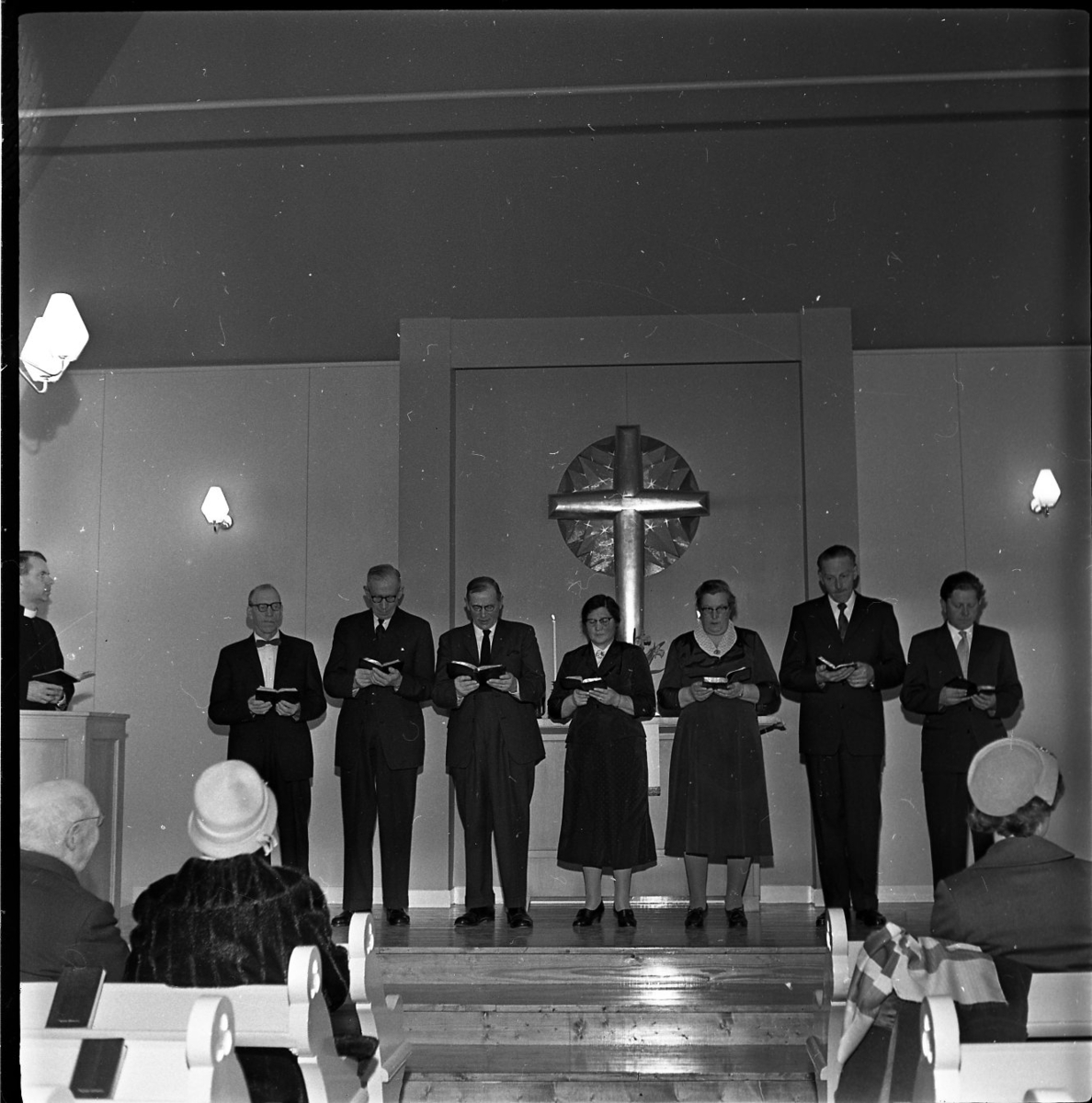 Sju personer står på rad framför ett altare. Bredvid dem står en präst i en talarstol.
