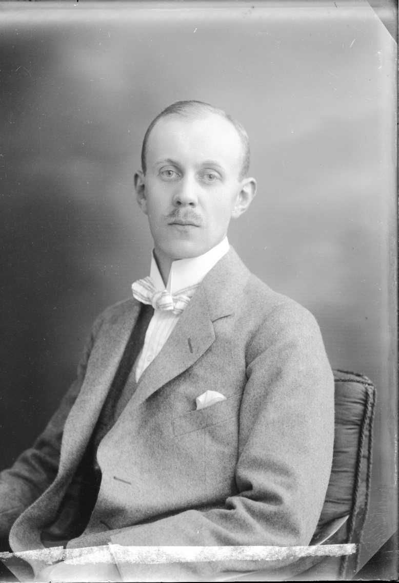Bröstbild av en ung tunnhårig man med mustasch. Han sitter på en stol.