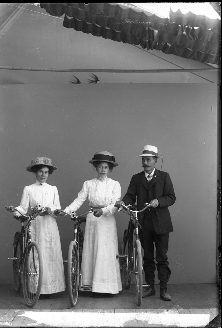 Två kvinnor och en man med varsin cykel. Mannen är Theodor Olsson från Gripenberg.