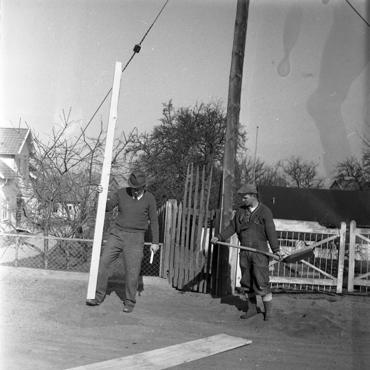 Män arbetar på Sjögatans södra del inför Gränna Lions marknad. Till vänster med en rest planka står troligen Karl-Erik Johansson med hatt och slips under en tröja. Intill står en man i overall och gummistövlar med en skyffel med sand. Det ligger också sand på marken i en sträng.