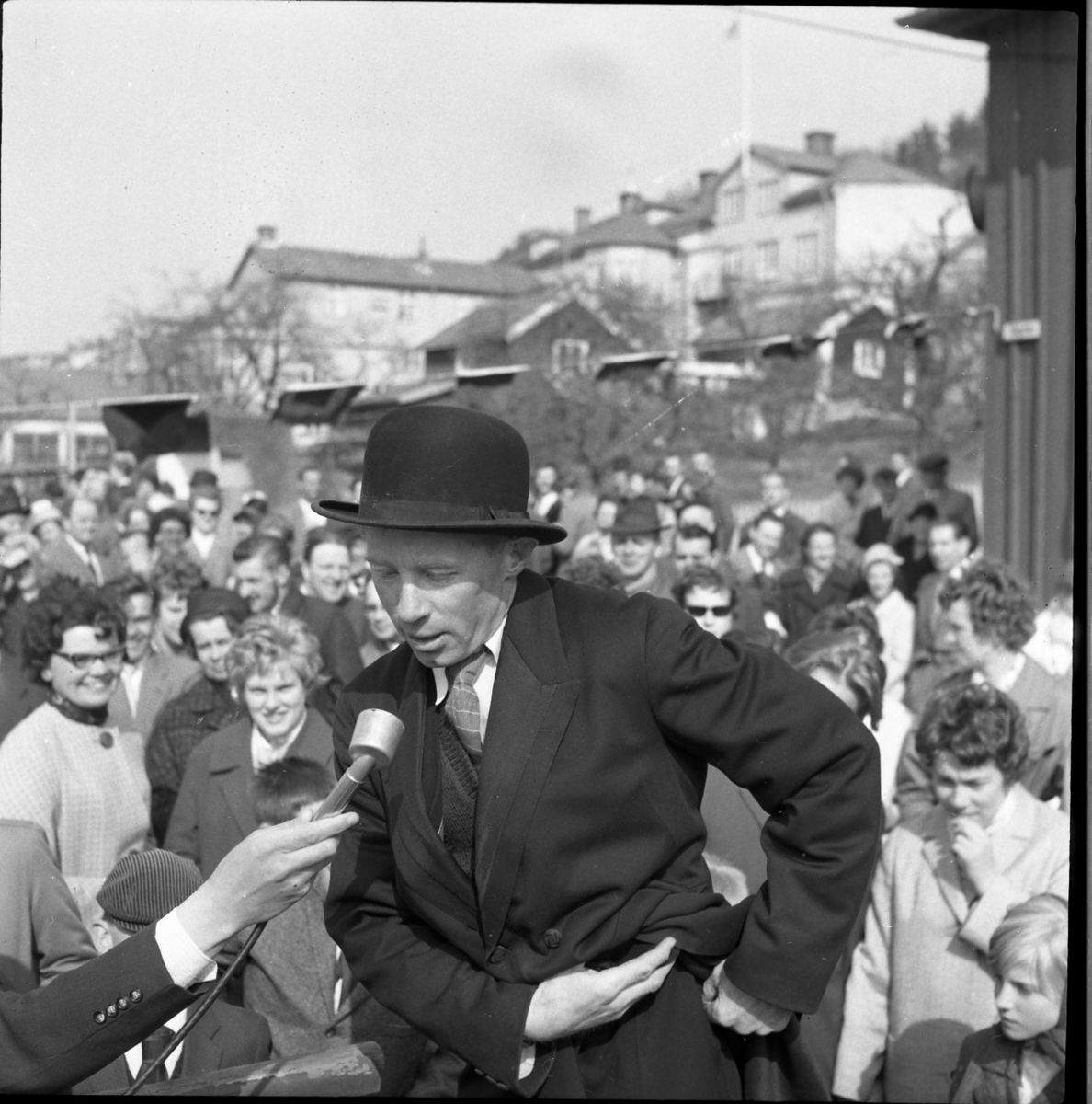 En man med kubb på huvudet och mörk kostym av äldre snitt sitter i en hästvagn och intervjuas av en man som står nedanför till vänster utanför bild. En stor folksamling runtomkring. Till vänster står en ung kvinna i ljust och med glasögon, det är möjligen Anita Johansson. De befinner sig på Sjögatan nedanför Hallska gården.