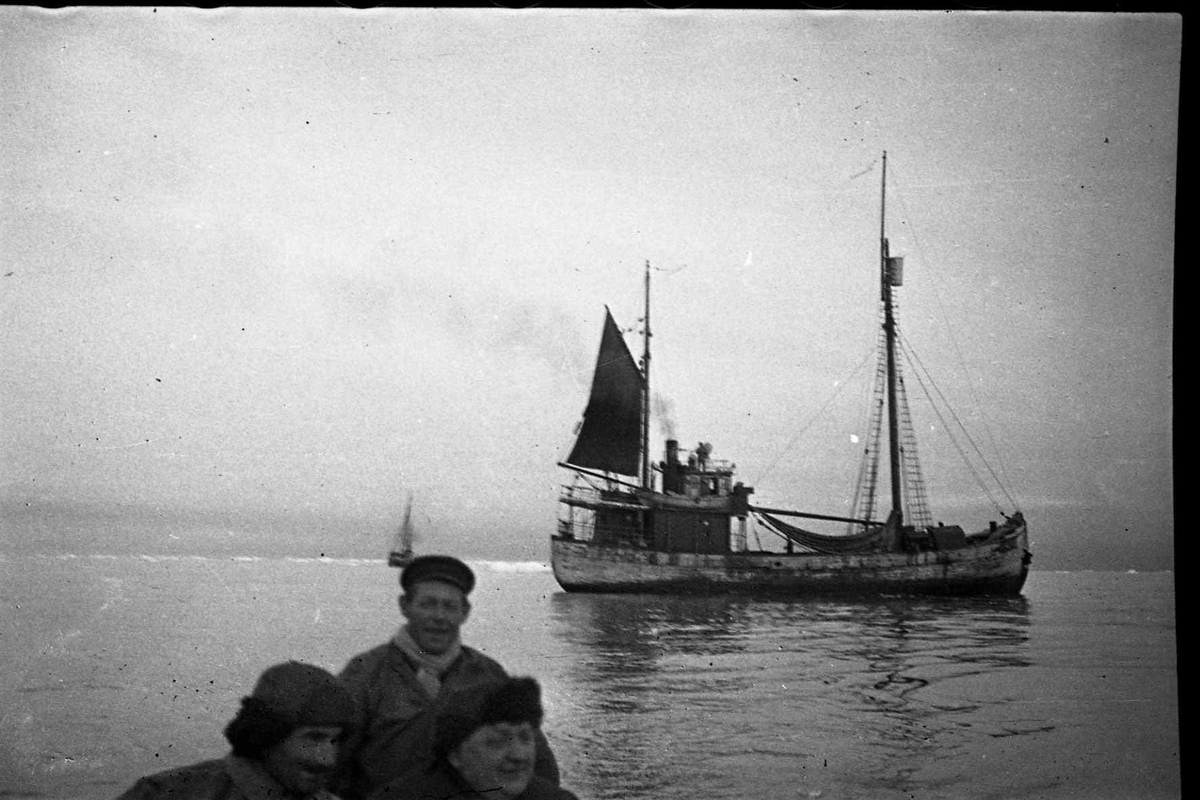 Överfart från Isbjörn till Vitön. Myhre till höger och möjligen Sörensen längst bak.