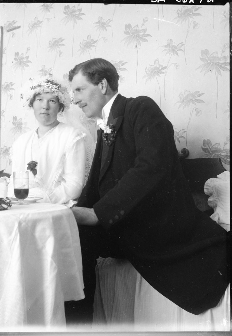 Ett brudpar sitter i en soffa med ett bord med duk och glas. Brudgummen lutar sig mot bruden.