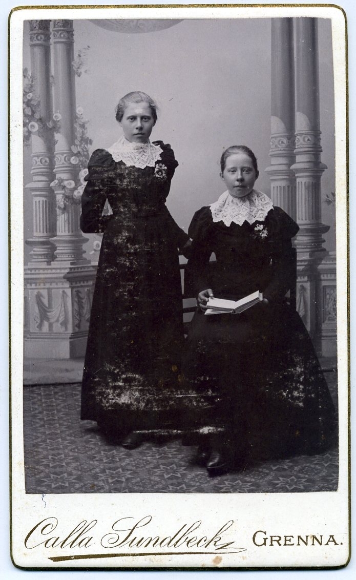 Kabinettsfotografi: gruppbild med två okänd ung kvinna, en stående och en sittande med en bok i knät. Bägge har en stor spetskrage..