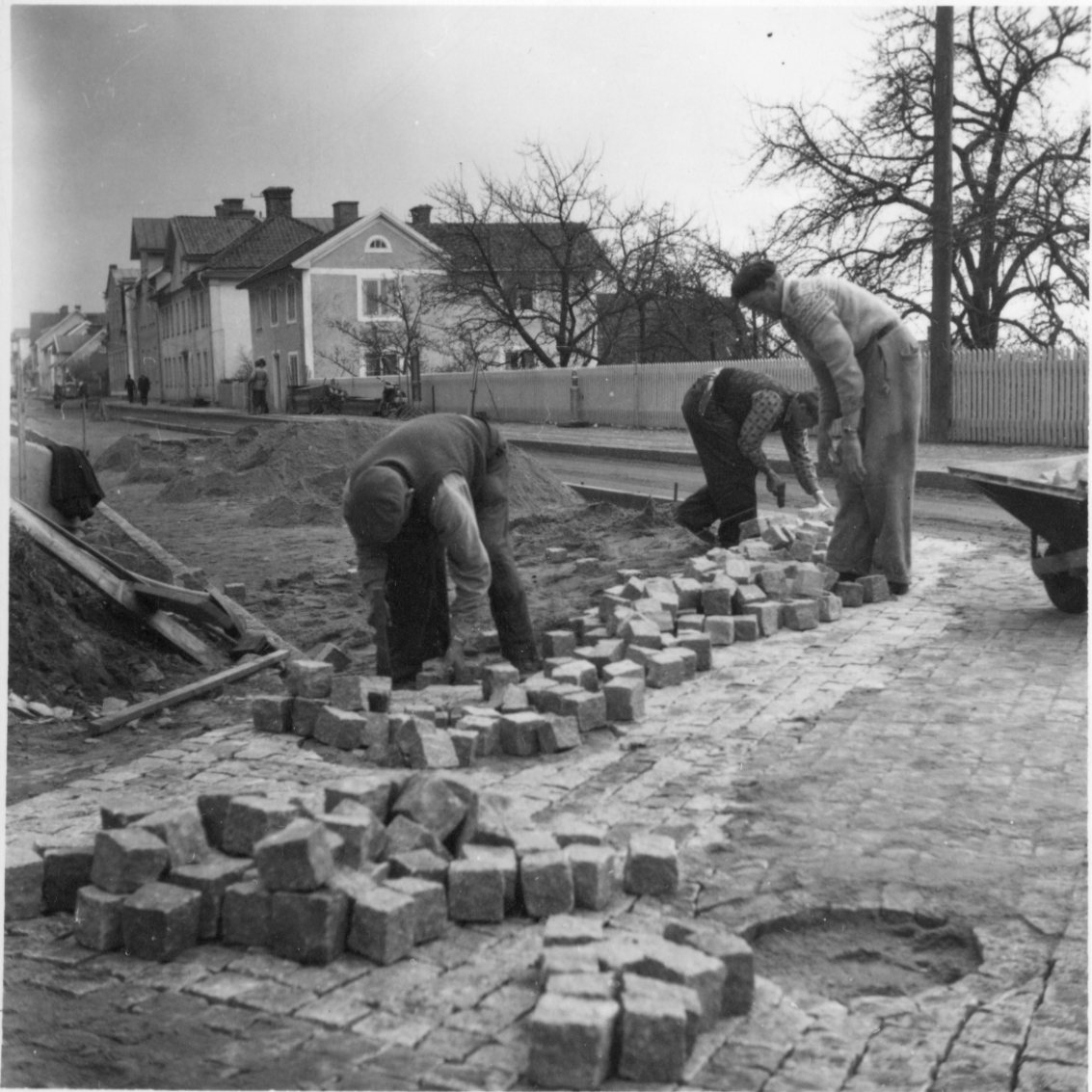 Tre män arbetar med stensättning av norra delen av Brahegatan i Gränna. Gatan har breddats.