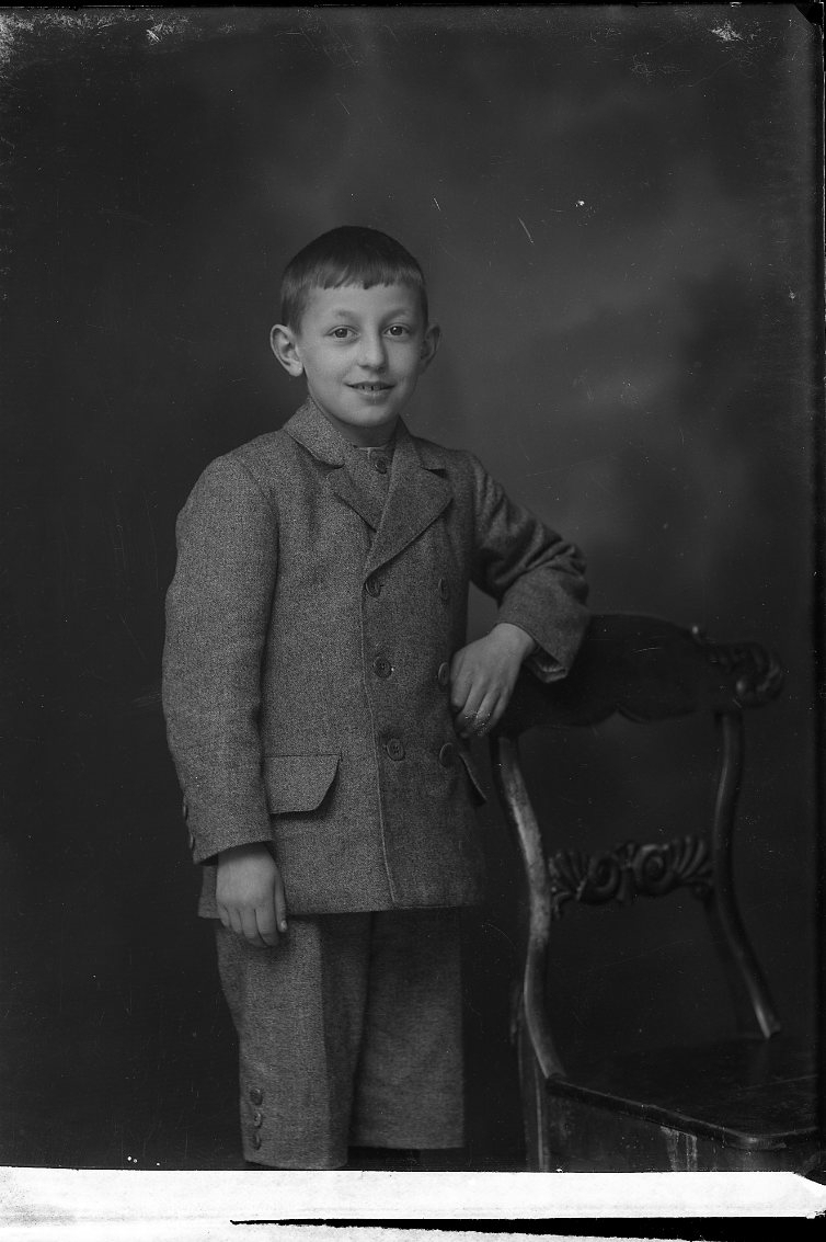 Porträtt av en pojke som står vid en stolsrygg.