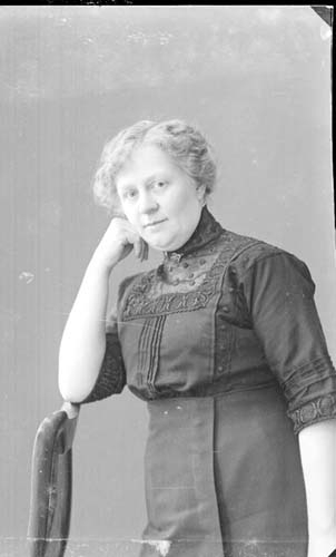 Porträtt av en kvinna klädd i mörk klänning. Hon står med höger armbåge på en stolsrygg och huvudet vilande i samma hand.