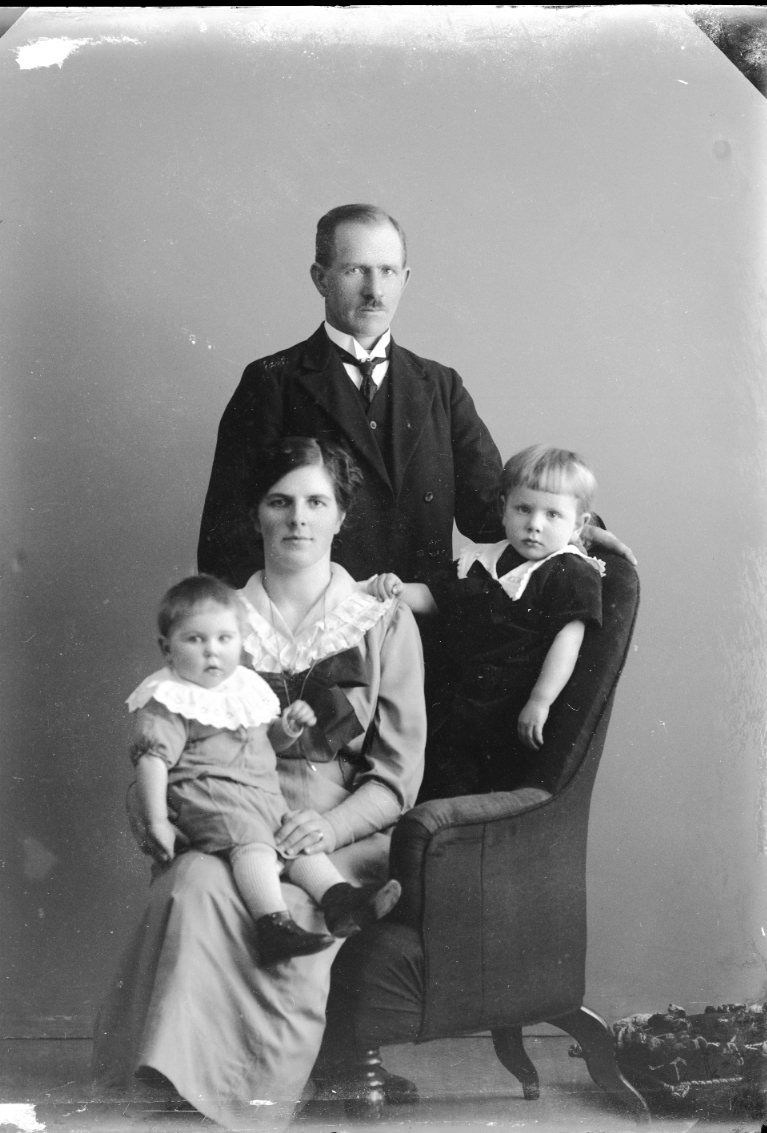 En kvinna sitter i en fåtölj med ett spädbarn i knät, bakom honom står ett barn. En man står bakom dem.