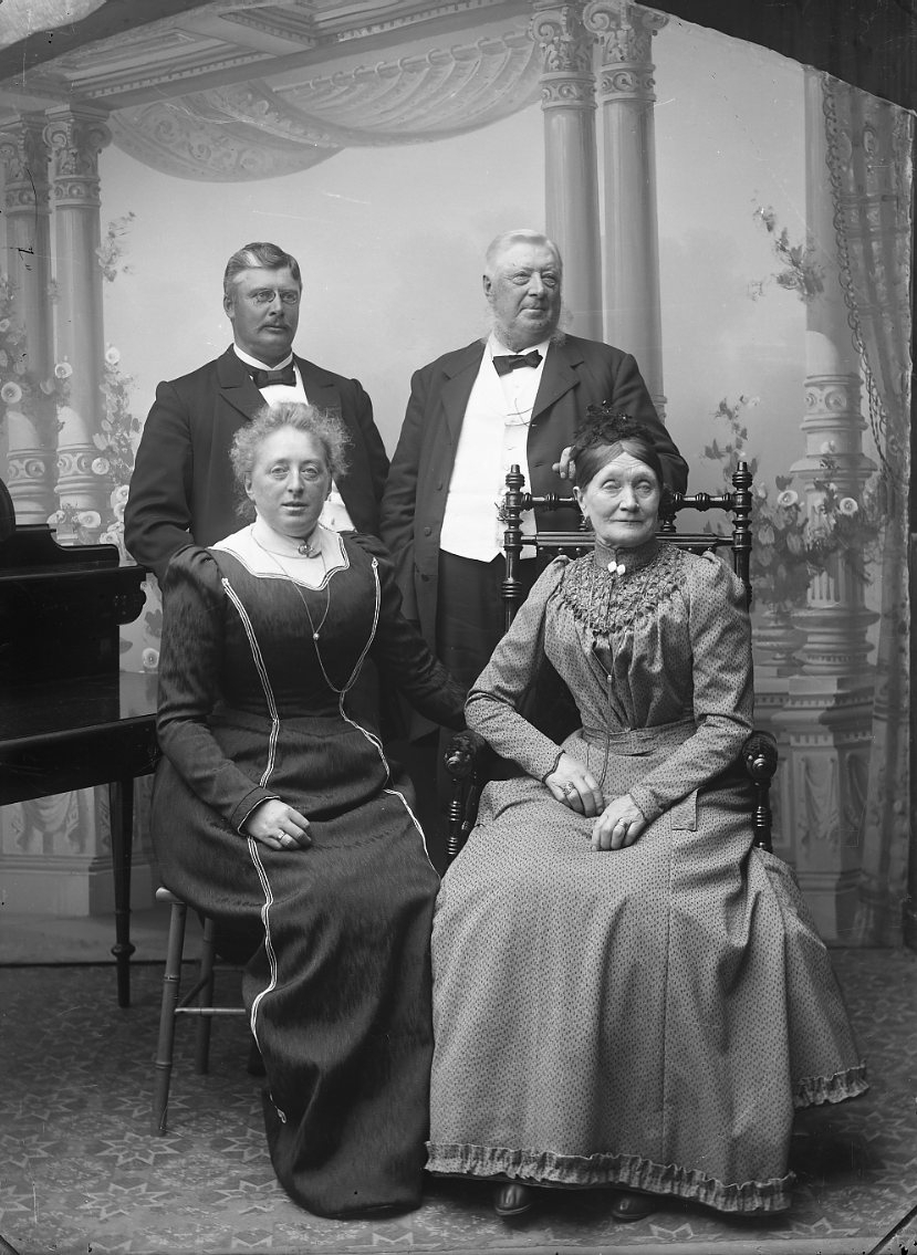 Två par i en fotoateljé. Kvinnan till vänster sitter på en stol och vilar vänster arm på ett skrivbord. Kvinnan till höger sitter i en gungstol och vilar fötterna på en kudde. Kvinnornas män står bakom dem. Det yngre paret, till vänster, är grosshandlare Mårten Persson och Anna Granlund.