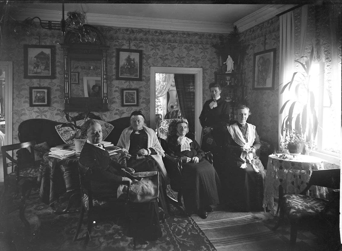 Fem kvinnor sitter hemma hos fröken Franck på Brahegatan i Gränna. Solen lyser in genom fönstret mot gatan. De är från vänster: Valborg Franck, fru Hård af Segerstad, madam Björkegren och hennes dotter fröken Tora Björkegren samt fru Björkman.