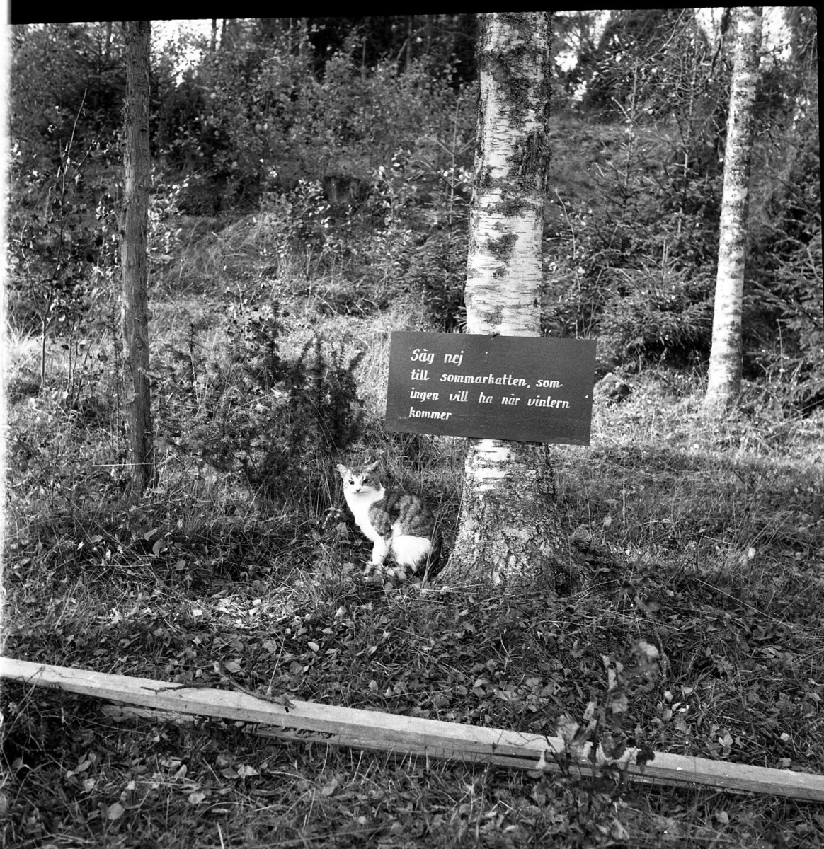 En katt sitter vid foten av ett träd. På trädet hänger en skylt som säger "Säg nej till sommarkatten som ingen vill ha när vintern kommer."