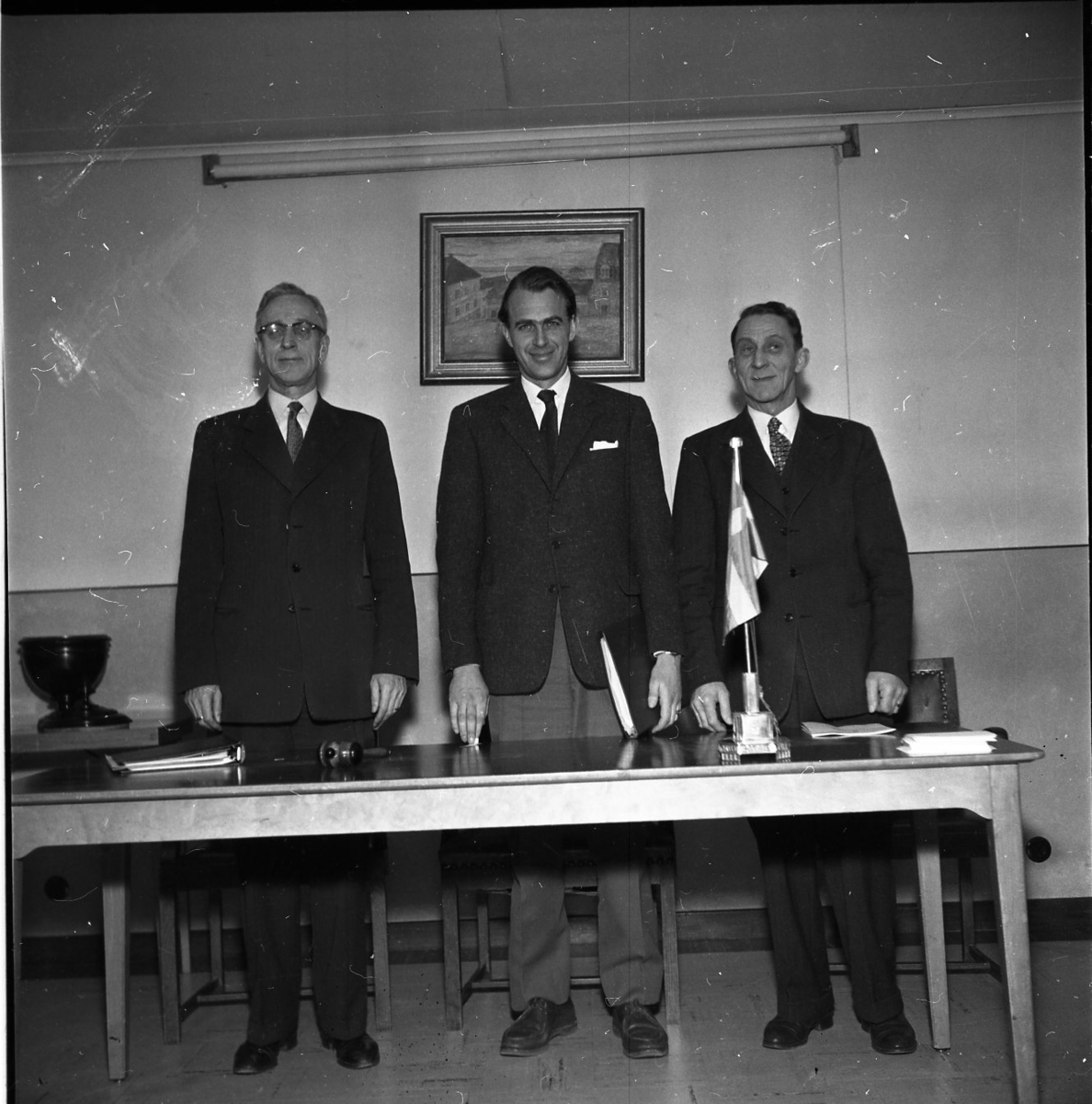 Tre herrar står på rad vid ett bord. På bordet ligger en ordförandeklubba.