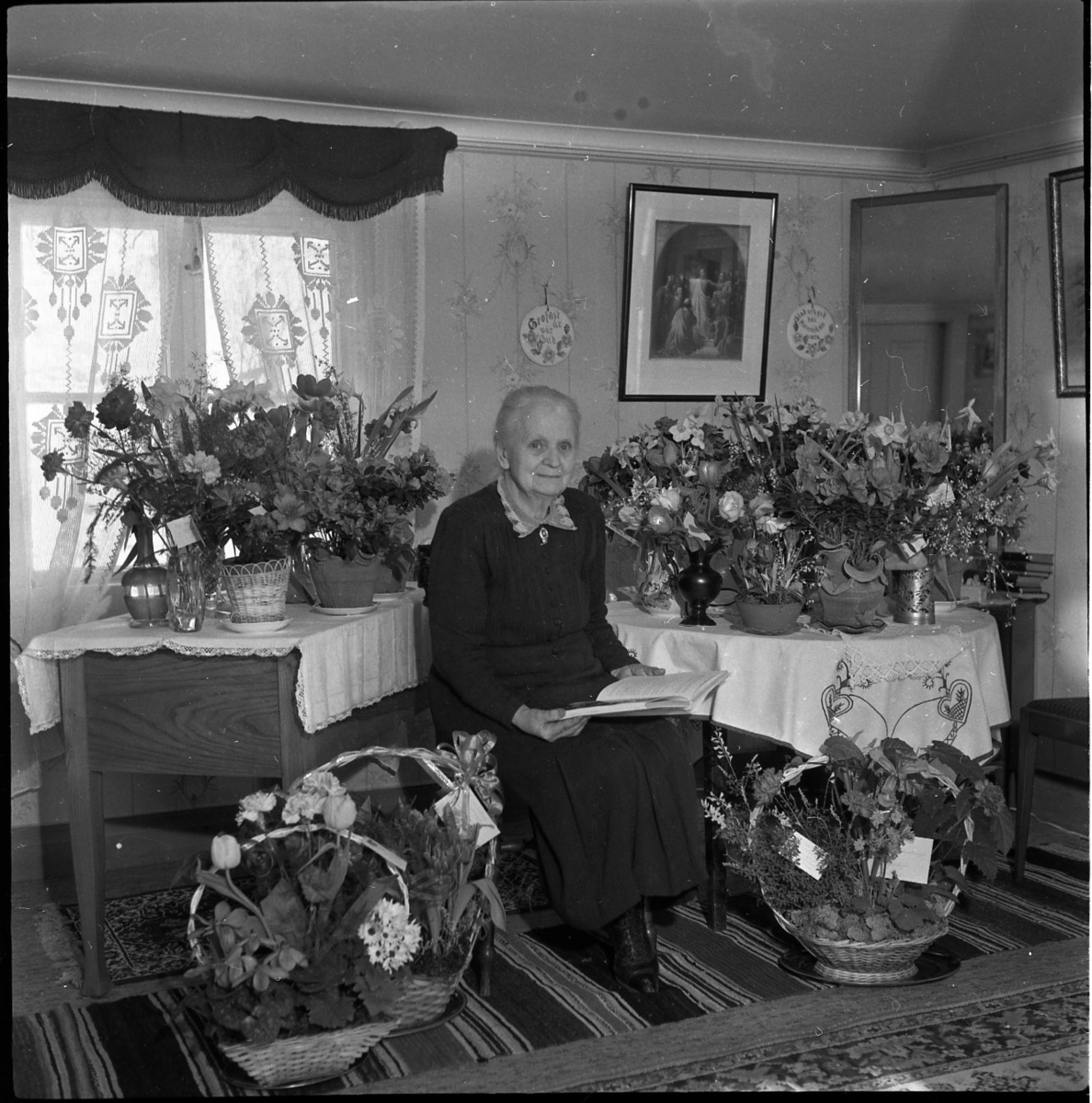 En kvinna sitter omgiven av blombuketter och blomsterarrangemang. Hon håller i en bok. Hon bär en svart klänning med spetskrage.