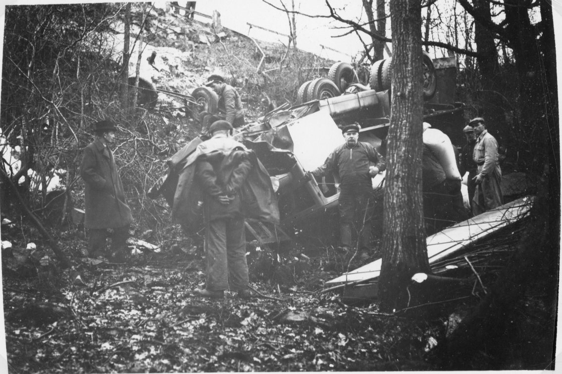 Ett fordon, möjligen en lastbil, har kört av vägen vid Galgen söder om Gränna. Fordonen ligger upp och ned i en slänt, omgiven av män.