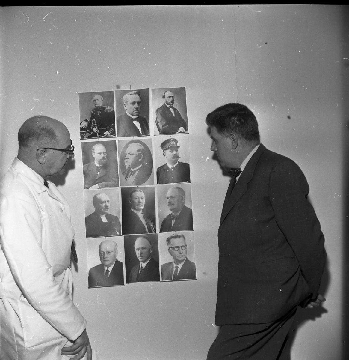 En bildserie med tolv porträttbilder föreställande ordförandena i kommunfulläktige sitter uppsatta på en vägg. Två män står och betraktar bilderna. Till höger står Sten Roman.