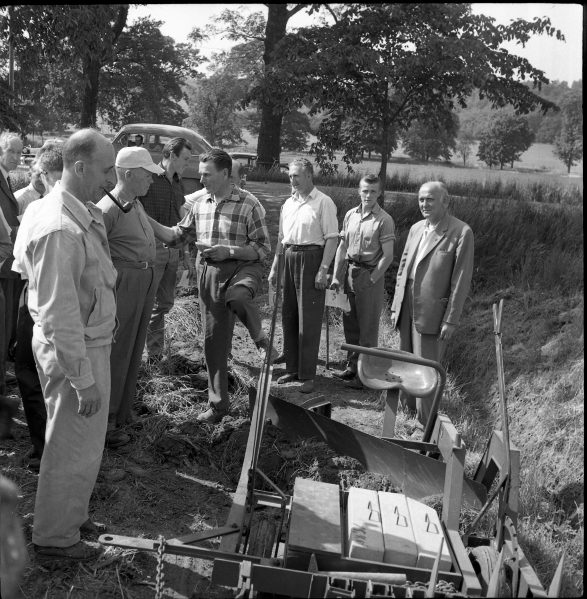 Flera män står upställda runt en grävmaskin för dikesgrävning. En man röker pipa.