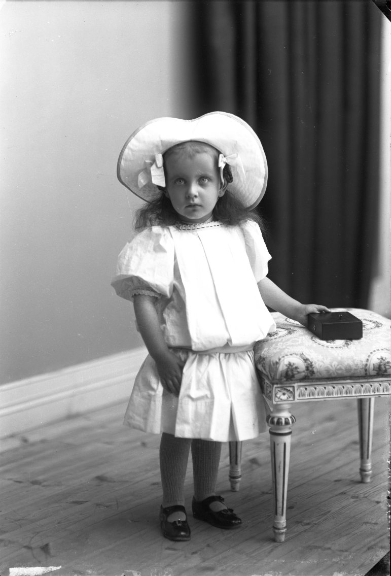 Porträtt av en liten flicka i ljus klänning och hatt. Hon står bredvid en pall.