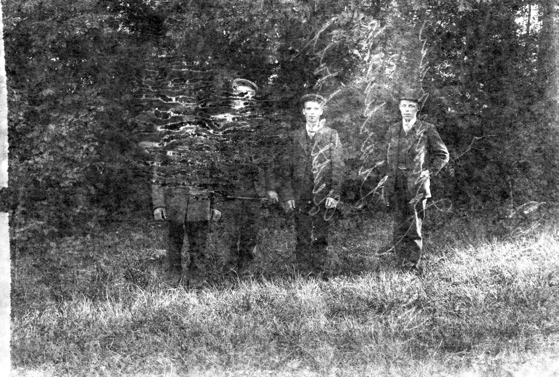 Fyra unga män står på en gräsplan, endast två till höger syns.