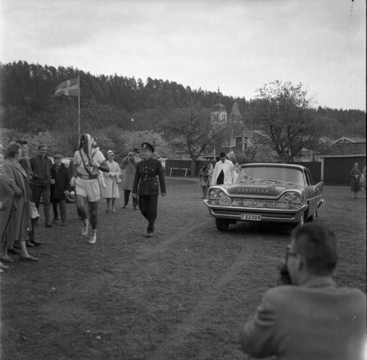 En man i träningskläder och handduk över huvudet kommer springade på ett gärde söder om Realskolan i Gränna. Hans väg kantas av skrattande publik. Bakom går en man klädd i militiär uniform. Till höger strax bakom löparen står en Chrysler.