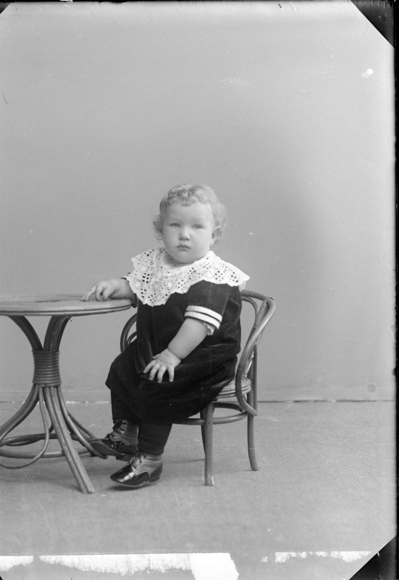 Porträtt av en liten lockhårig pojke som sitter i en barnmöbel.