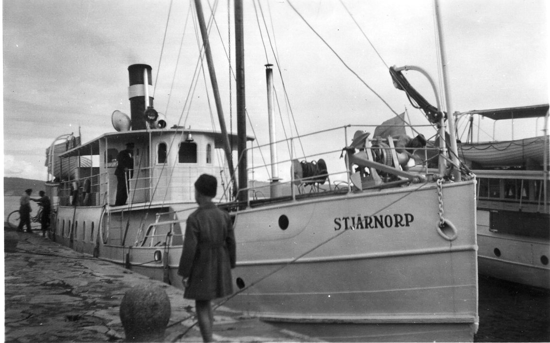 Motoriserade ångbåten M/S Stjärnorp, troligen vid kaj nedanför Visingsborgs slottsruin på Visingsö. Passagerare ombord, barn och vuxna.