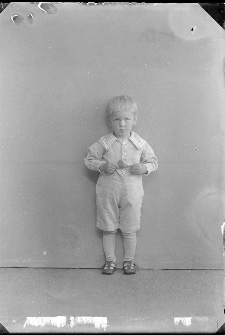 Porträtt av en liten pojke i sjömanskostym. Han håller troligen en leksak i händerna.