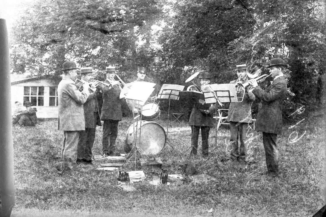 Sex män med blåsinstrument och en med trumma står på en gräsplan och spelar, troligen i närheten av Visingsborgs slottsruin.