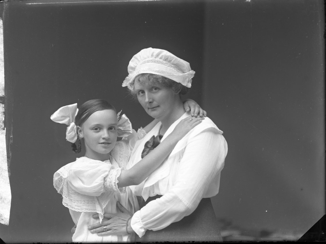 En liten flicka med rosetter i håret håller sin armar om halsen på en kvinna med tunn, ljus, hatt. De vänder huvudet mot fotografen.