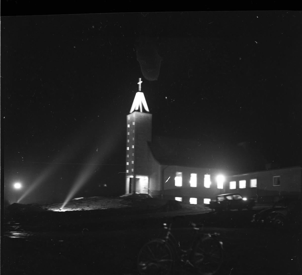 Titel: Det är natt. Mitt i bilden står en upplyst kyrka.