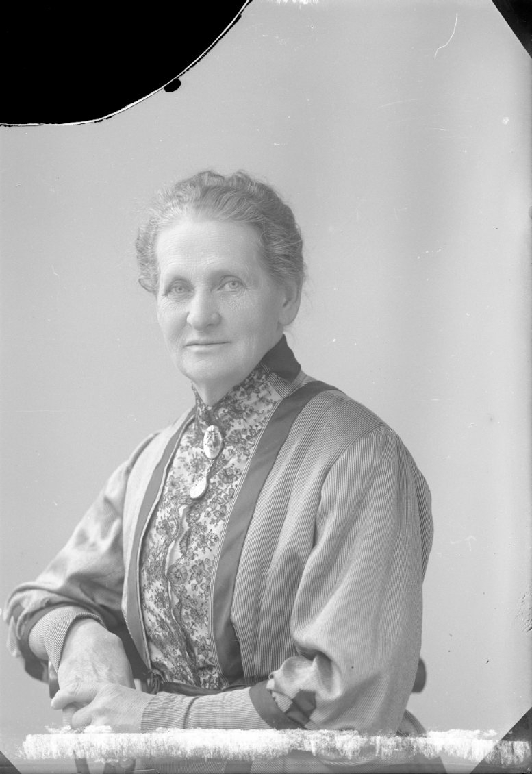 Porträtt av en äldre kvinna som sitter i en fåtölj.