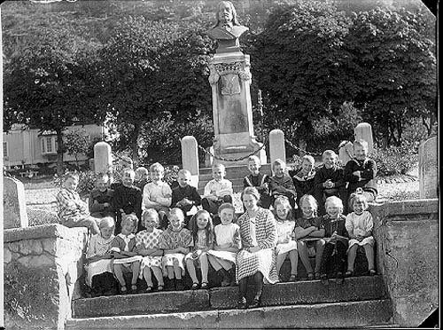 Småskolebarn från Adelöv sitter med en kvinna i rutig klänning i trappan upp till Gränna torg, med Brahebysten bakom sig.