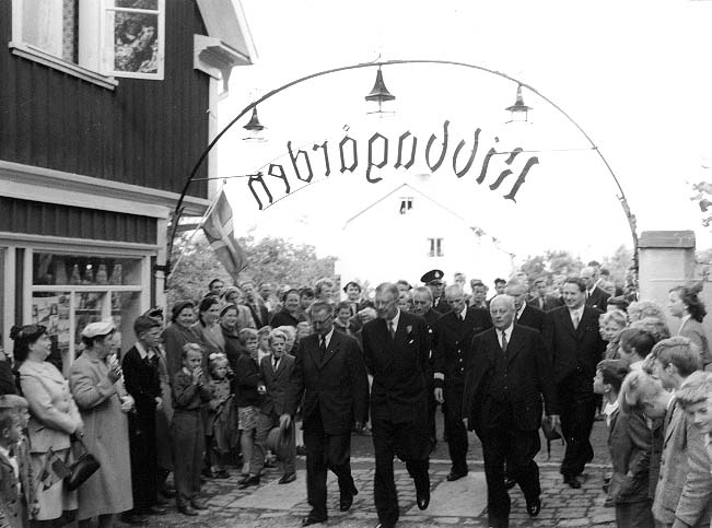 Kung Gustaf VI Adolf går in till Ribbagårdens trädgård, flankerad av stadens representanter Thure Ekwall till vänster och Ivar Ekvall till höger. Bakom, i uniform, går landshövding Olle Ekblom.