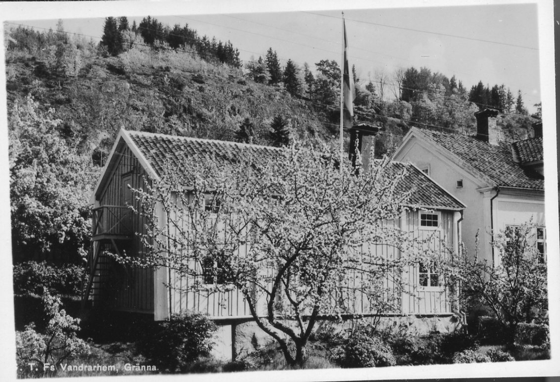 Brahegatan 54 i Gränna, bakom blommande fruktträd.