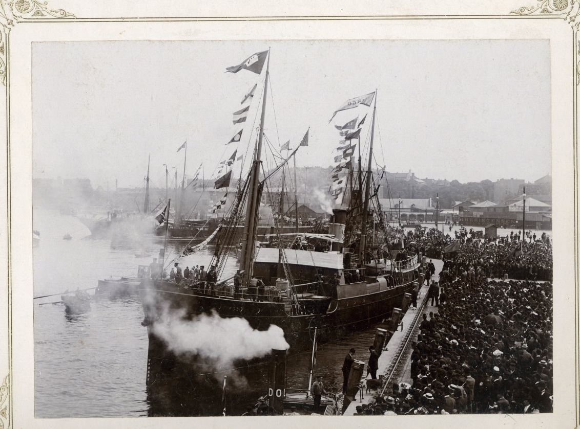Virgo lämnar kajen i Göteborg för färd mot Spetsbergen. Närmast fartyget står en mindre grupp och vinkar, på avstånd och ömse sidor om dem står en större folksamling. På akterdäck syns expeditionsmedlemmar vinka mot folksamlingen.