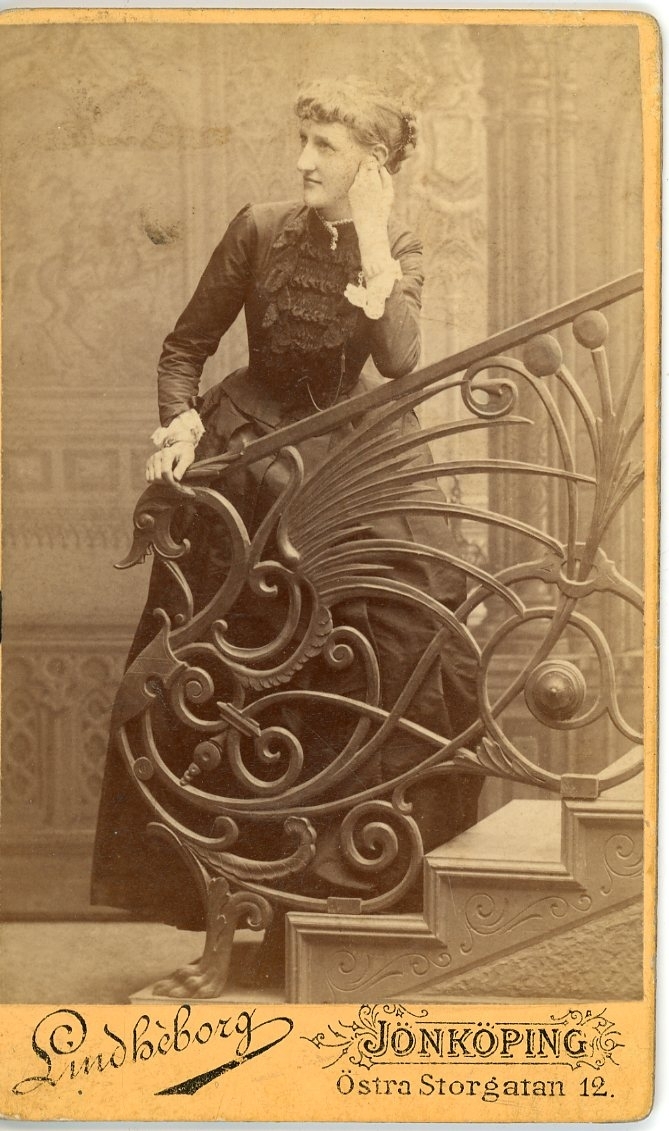 Kabinettsfotografi av en okänd ung kvinna som står i en trapp - i en ateljé.