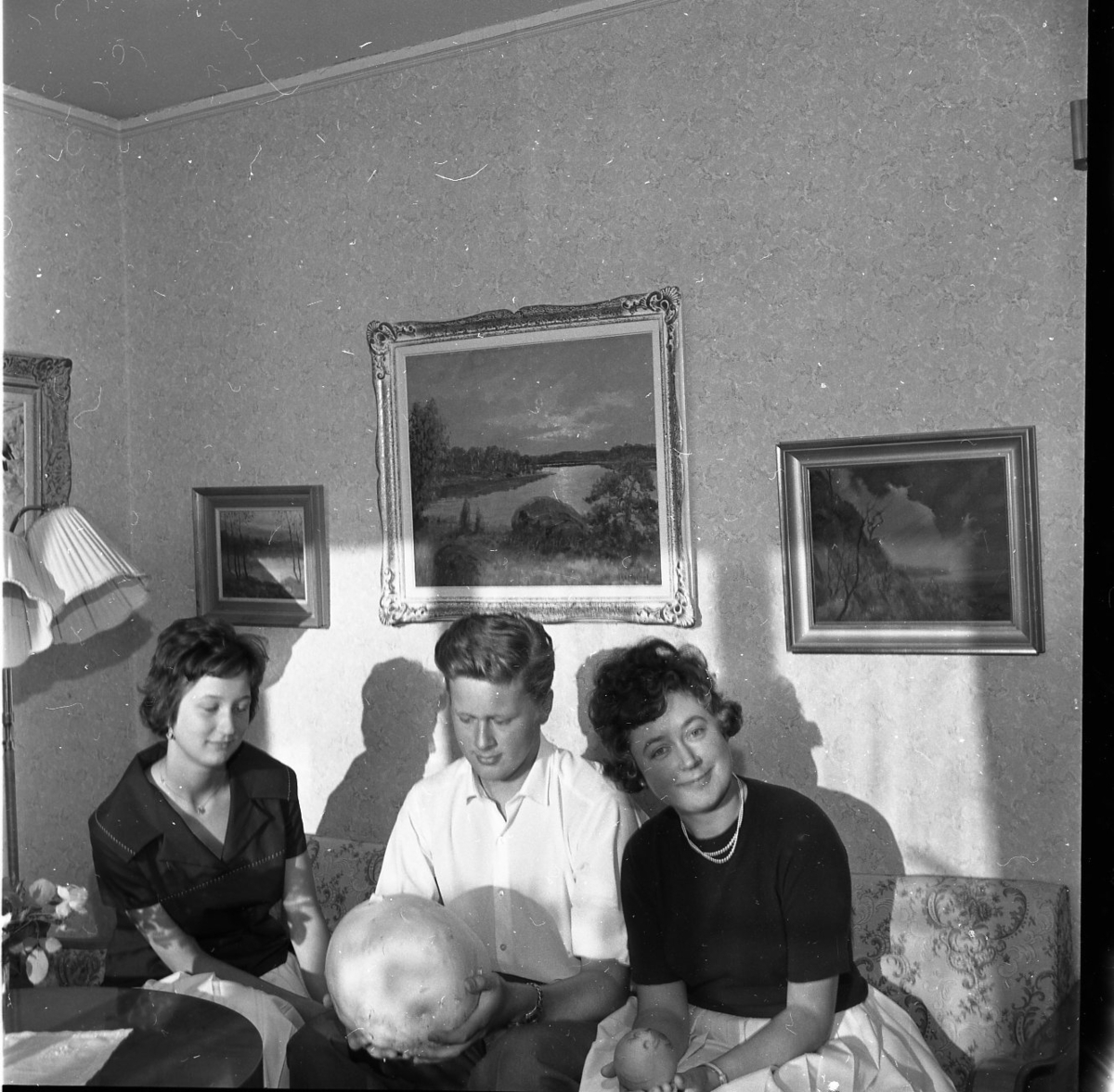 Tre personer sitter i en soffa i en hemmiljö. En man sitter i mitten och håller i vad som ser ut som en gigantisk röksvamp. Han tittar på svampen. Två kvinnor sitter på vardera sida om honom och tittar mot kameran.