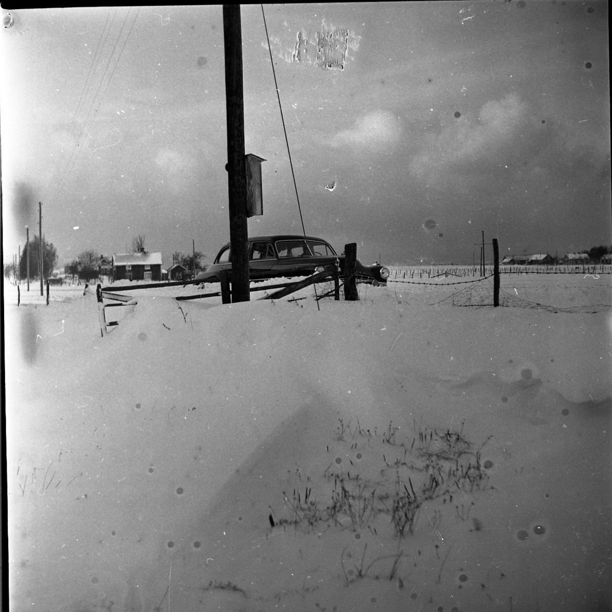 Vinterlandskap. En bil står parkerad vid sidan av en väg, knappt synlig för snödrivor.