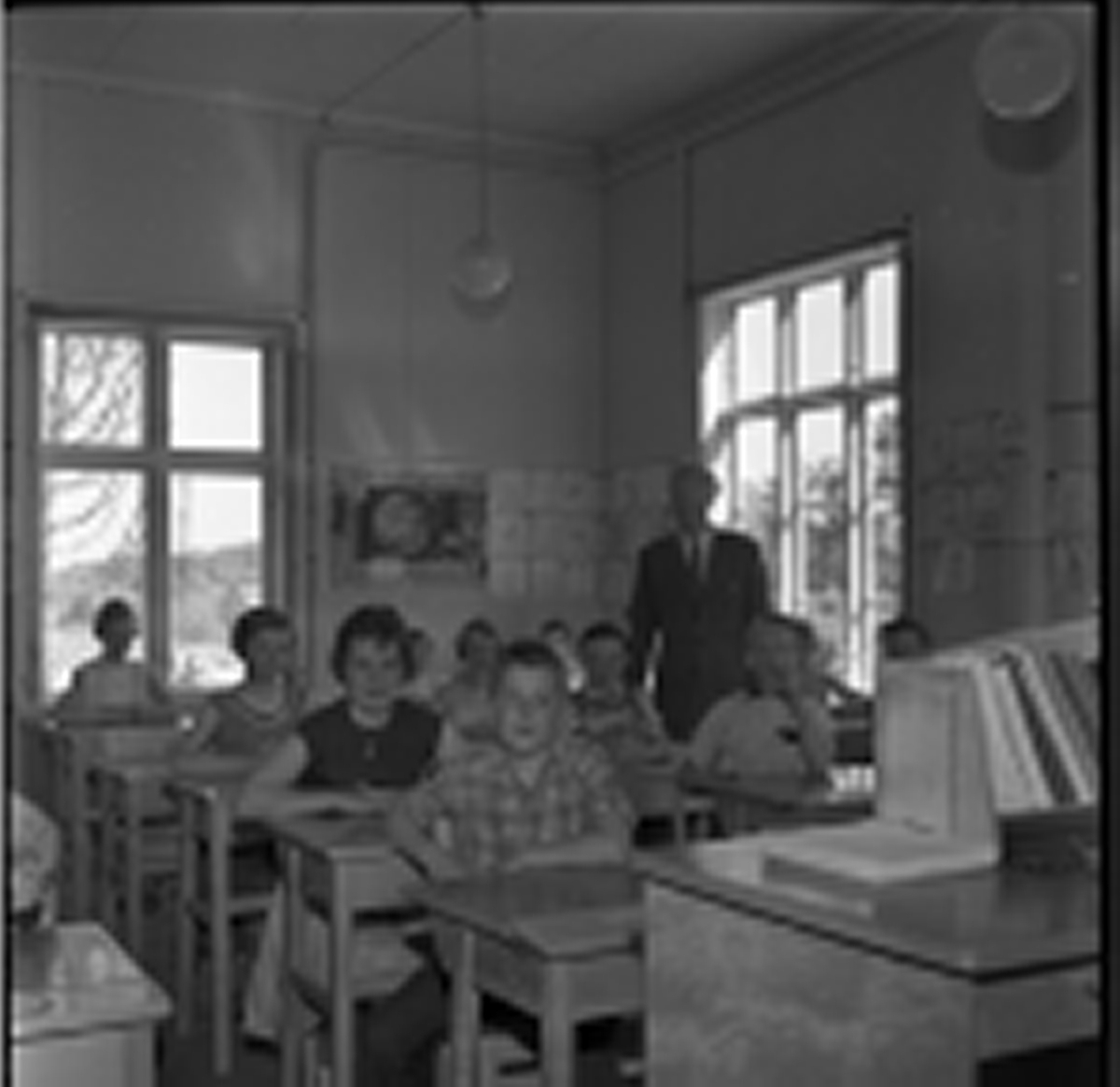Skolelever sitter i sina bänkar, de tittar in i kamerna. På väggen bakom dem hänger teckningar och en planch med en planet på. Läraren står och iaktar eleverna.
