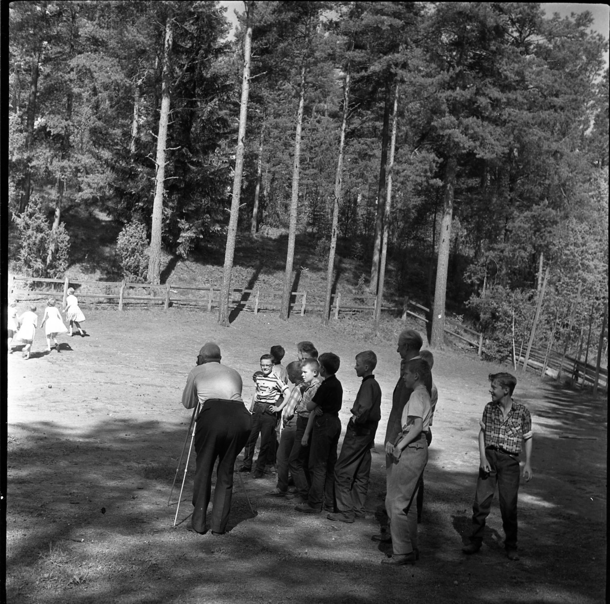 Barn leker på en gräsmatta vid ett skogsbryn. Några pojkar står bredvid och tittar på. En man står och fotograferar de lekande barnen.