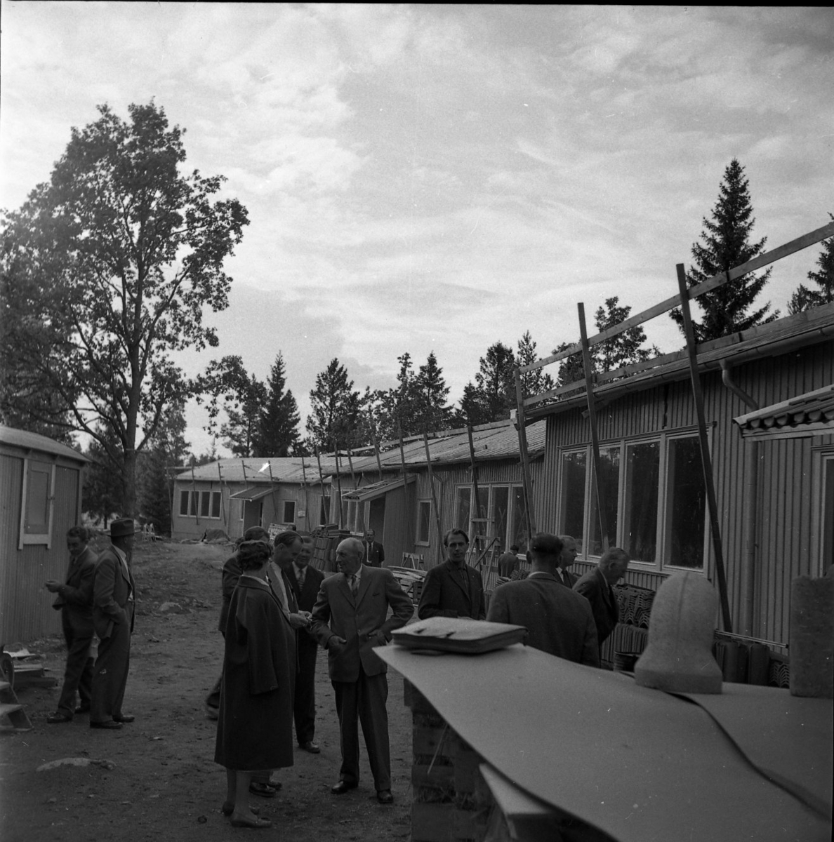 Kvinnor och män står vid en byggarbetsplats. De tittar på en halvt uppbyggd barack.