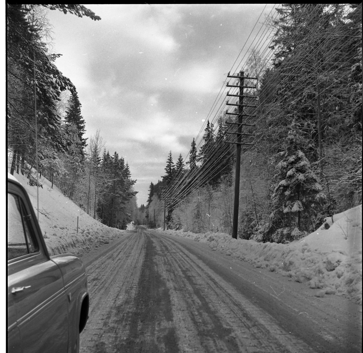 Vinterlandskap. En bil står parkerad vid sidan av en landsväg. Ingerydsdalen mellan Bröttjemark, Ölmstad och Bunn.