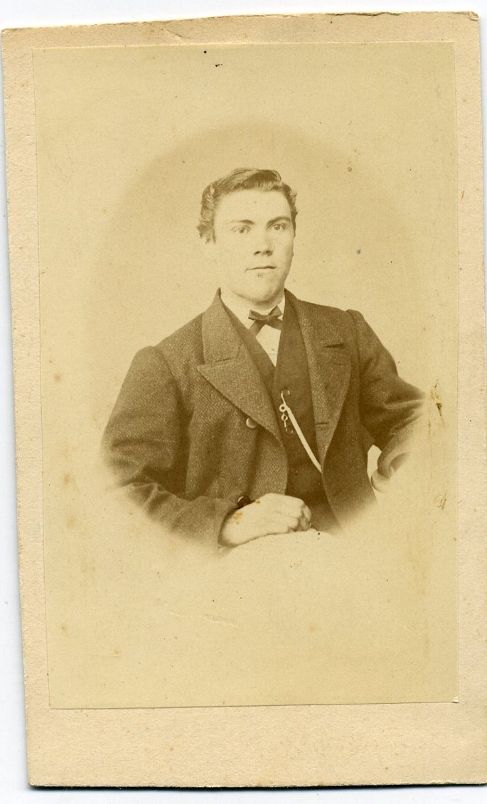 Kabinettsfotografi: bröstbild av okänd sittande ung man med klockkedja.