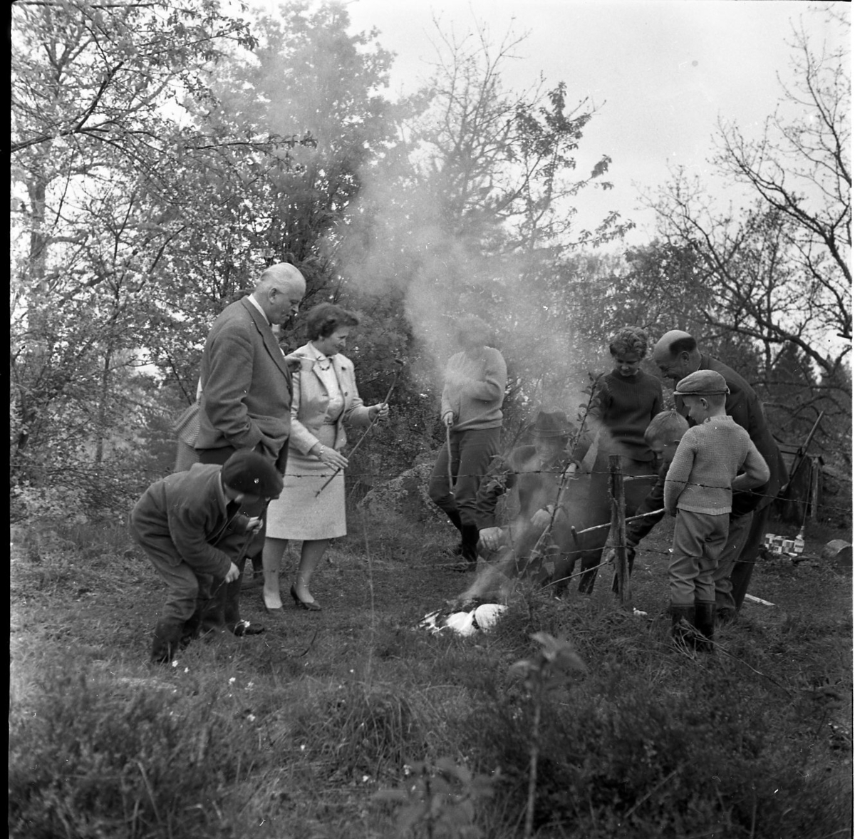 Barn och vuxna samlade runt en eld för korvgrillning. Några ryggar för röken. Det är gökotta, möjligen i Gränna Lions regi. De vuxna till vänster är Sture Petri och Margit Antonsson.