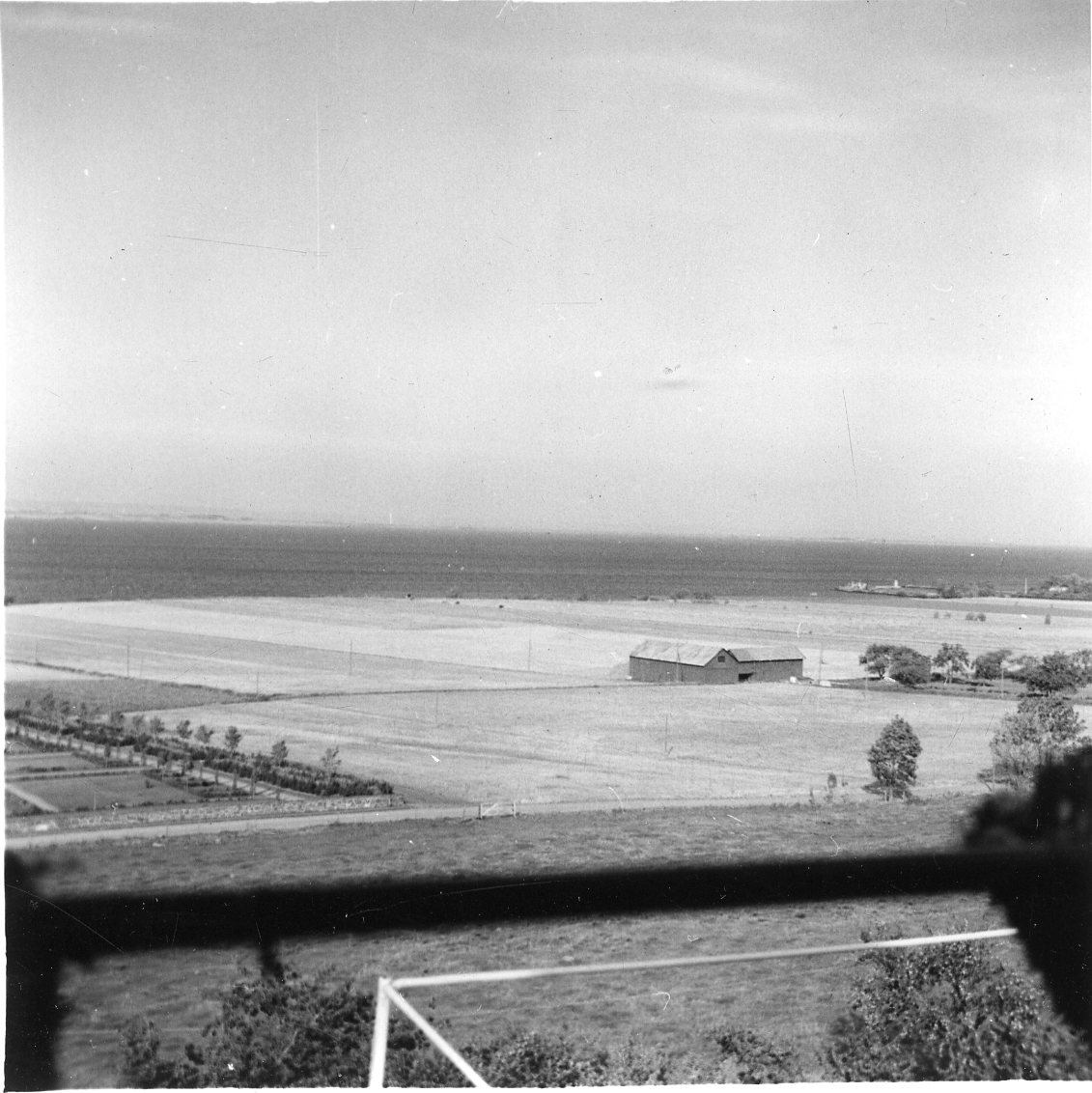 Utsikt mot Vättern från balkong på Brahegatan 3. Till vänster syns norra delen av kyrkogården, en numera riven ekonomibyggnad i vinkel samt hamnen till höger.