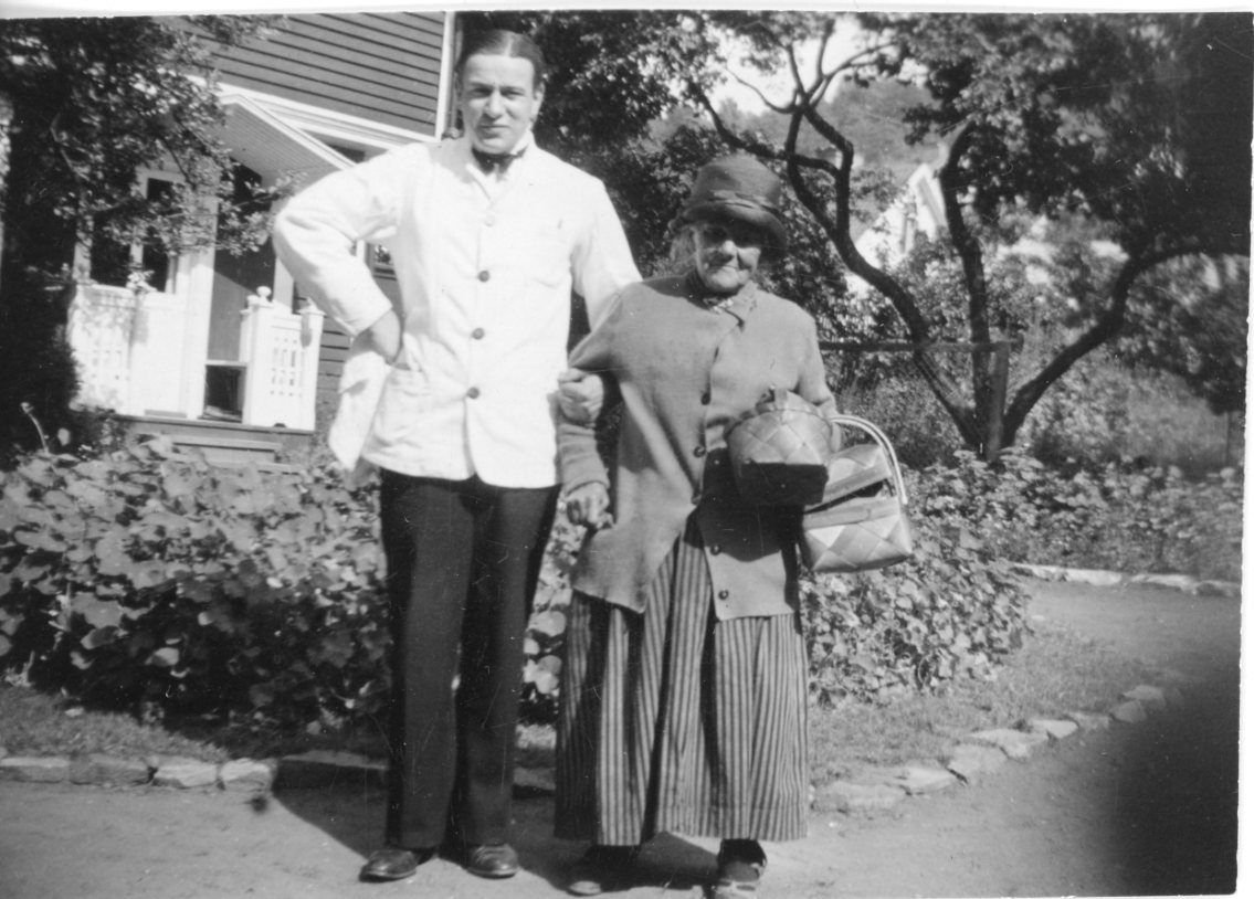 En servitör står intill en äldre kvinna som bär på korgar. Han håller om henne andra arm.