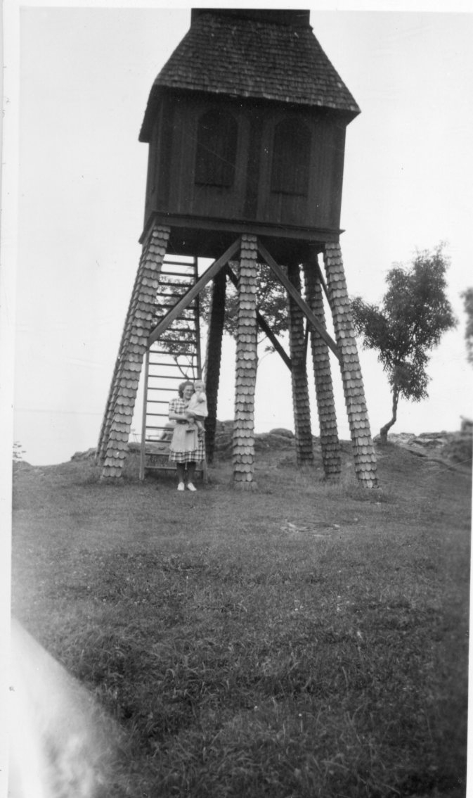 En kvinna med glasögon, rutig klänning och förkläde står med ett litet barn i famnen vid klockstapeln på Grännaberget.