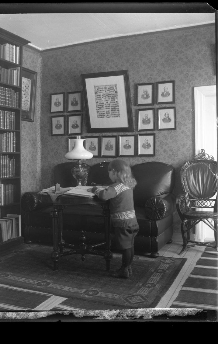 En liten pojke står i ett rum vid ett bord och en skinnsoffa. På väggen hänger ett stort antal porträtt på präster.