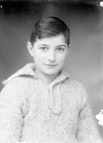 Porträtt av en mörkhårig pojk, bröstbild. Han har en stickad tröja med krage på sig.