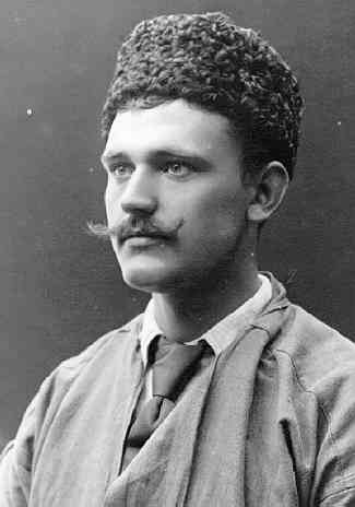 Porträtt, bröstbild, av Axel Edvard Bolling med mustasch samt pälsmössa på huvudet.